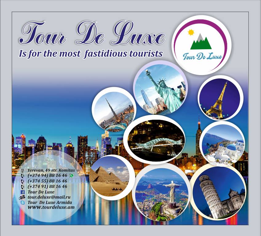 "Tour De Luxe" - компания для самых требовательных туристов. В сфере туризма, мы с 2011 года. Наша компания входит в ассоциацию туроператоров и турагентов Армении. *Мы предлагаем отдых в лучших курортах и отелях; *Мы организуем групповые, индивидуальные, спортивные и лечебные туры; *Мы оказываем гарантированное и качественное обслуживание. Наши высококвалифицированные специалисты уделяют индивидуальное внимание к каждому клиенту и обеспечивают максимальную заботу.